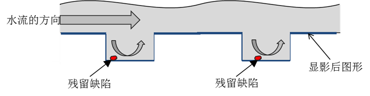 模型从缺陷的受力角度出发,在对显影后残留在旋转晶圆表面上的缺陷进行去离子水(Deionized Water, DIW)冲洗时,其主要受到三个力的作用,即:去离子水的推力,旋转带来离心力和氮气的推力,合力随半径的变化如图2(a)所示。当合力达到阈值时,缺陷颗粒将从光刻图形的表面边缘被去离子水冲走。阈值定义为显影后残留缺陷的表面与晶圆表面之间的粘滞力。当合力小于阈值时,即对残留缺陷的总拔除力小于残留缺陷与晶圆之间的粘滞力时,显影后的残留无法被去除,造成最终的显影后缺陷,在后续的曝光中导致坏点,如图2(b)所示。